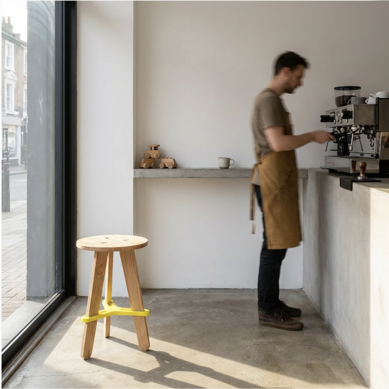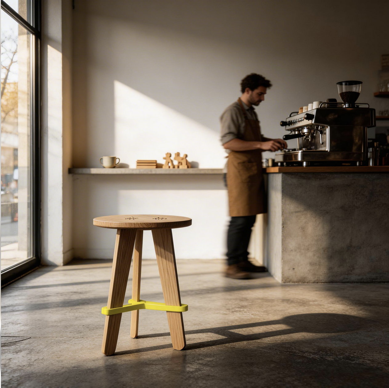A refined product shot showcasing the stool positioned in a minimal specialty coffee space defined by raw concrete surfaces and a restrained white palette. The scene is anchored by a La Marzocco espresso machine softly out of focus in the background, its polished metal catching ambient light. The interior is pared back — exposed concrete walls, smooth poured concrete floor, minimal shelving — letting the stool's form speak clearly in the foreground. Seated patrons in organic, earth-toned slow fashion garments occupy the mid-ground, their relaxed postures conveying unhurried ritual. A waiter crosses the frame with deliberate motion blur, a streak of movement that contrasts with the stillness of the stool and its surroundings, reinforcing the object's grounded presence. Natural light enters from a large storefront window, washing the concrete in soft, cool tones and casting long, gentle shadows. The composition positions the stool as the quiet protagonist of a space where material honesty, craft, and slow living converge."